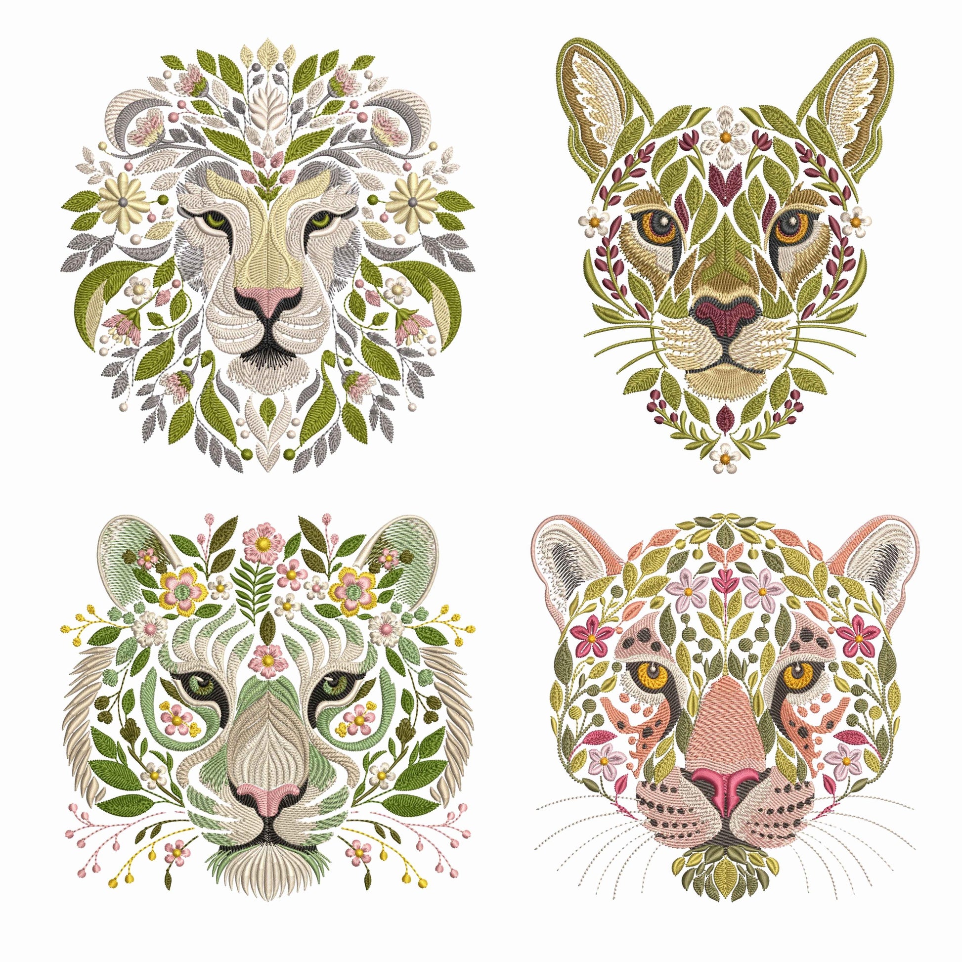 This exclusive bundle features FOUR intricately designed big cat headsβthe Lion, Tiger, Jaguar, and Pumaβeach crafted using beautiful botanical elements, including leaves, vines, and small delicate flowers. This Floral Big Cats Set is perfect for those who love nature, wildlife, modern bohemian style, or unique, highly detailed embroidery.