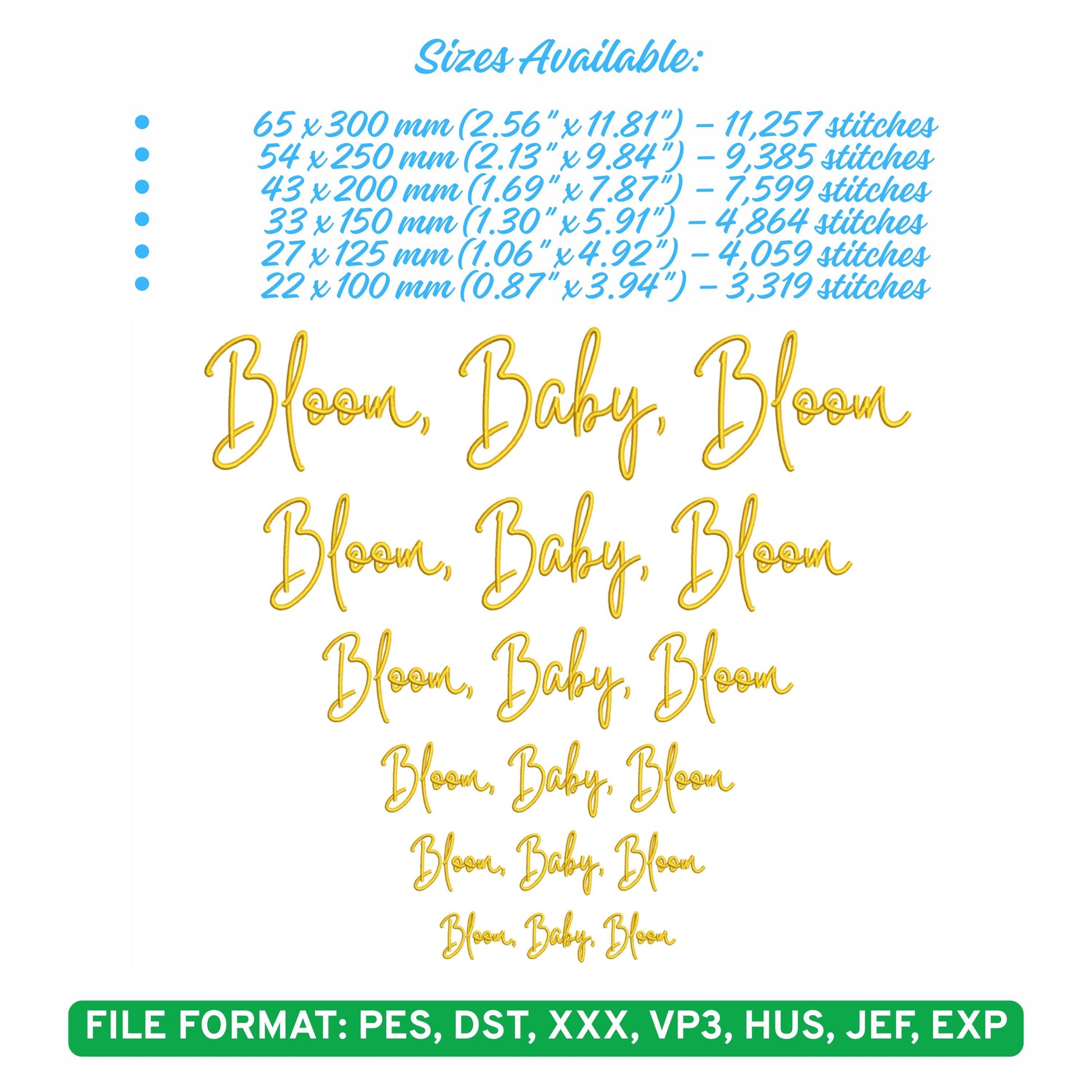 β¨ Unleash the beauty of nature with this stunning "Bloom, Baby, Bloom" embroidery design! This vibrant, cursive text design will add a cheerful and inspiring touch to any project. Perfect for creating personalized gifts, home decor, clothing, or accessories. With its elegant flow and bold yellow color, itβs sure to brighten up any creation!
