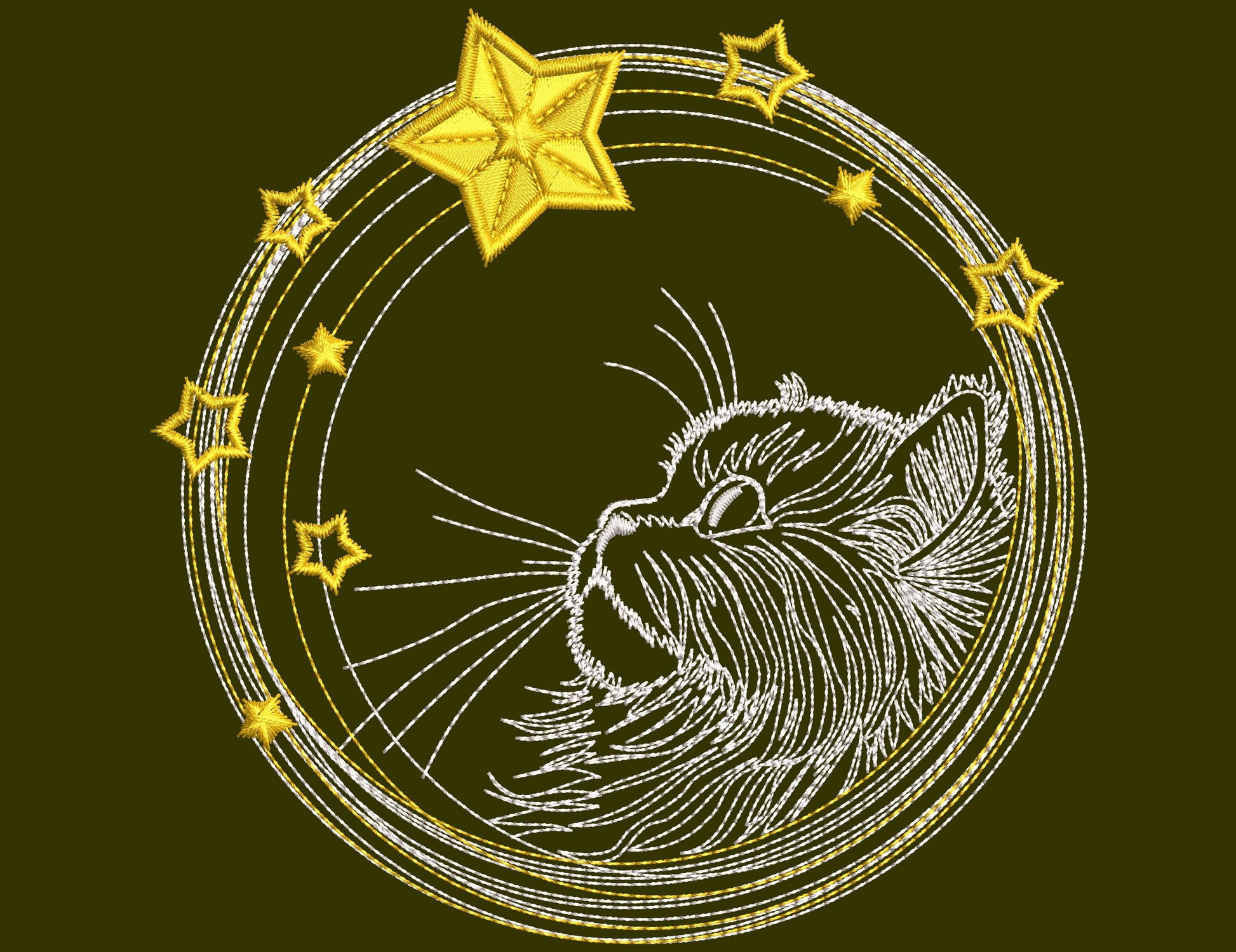Bring the magic of the stars into your craft projects with this stunning "Celestial Cat" embroidery design! Perfect for cat lovers and stargazers alike, this design features a beautifully detailed cat gazing at the stars, surrounded by a circle of glowing golden stars. Ideal for adding a whimsical and elegant touch to your projects!