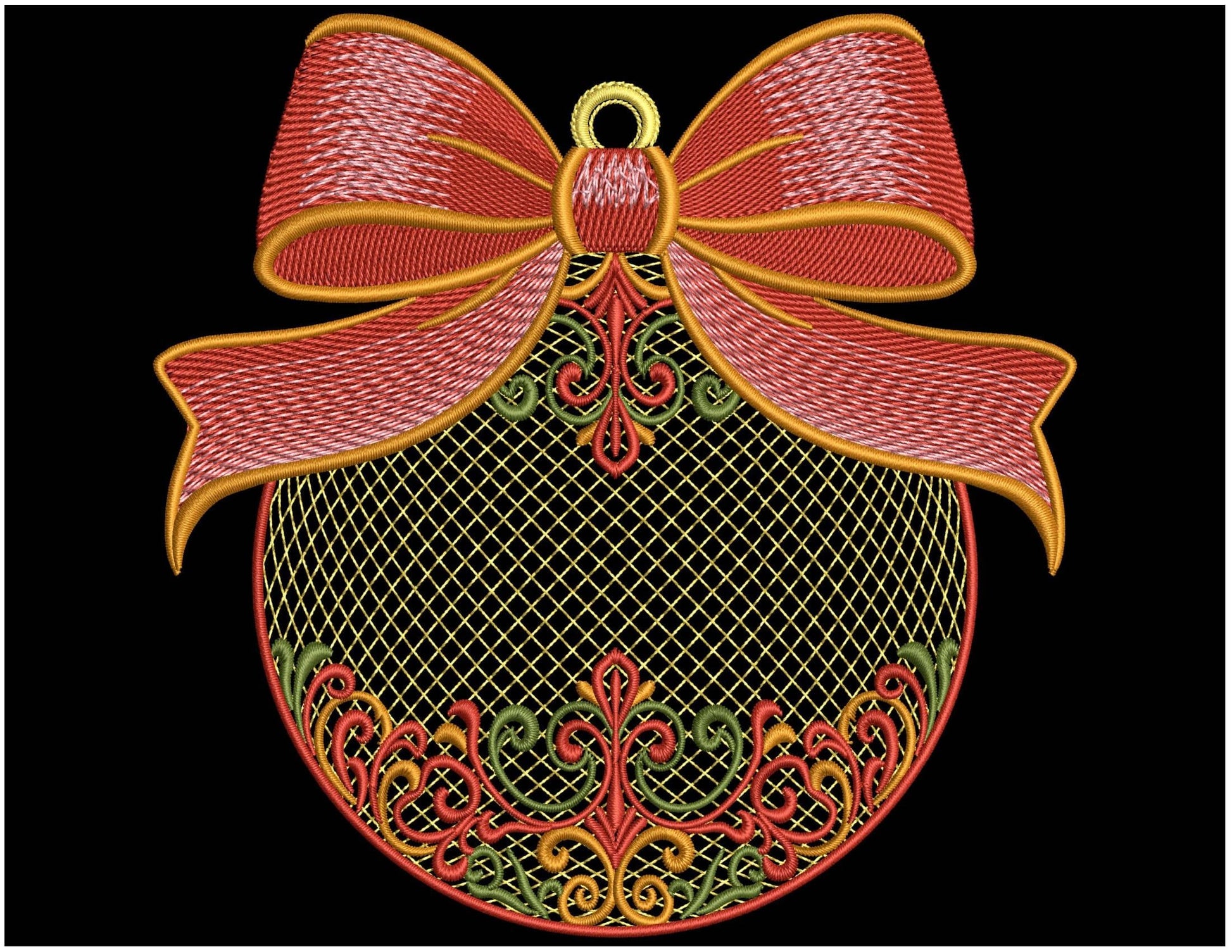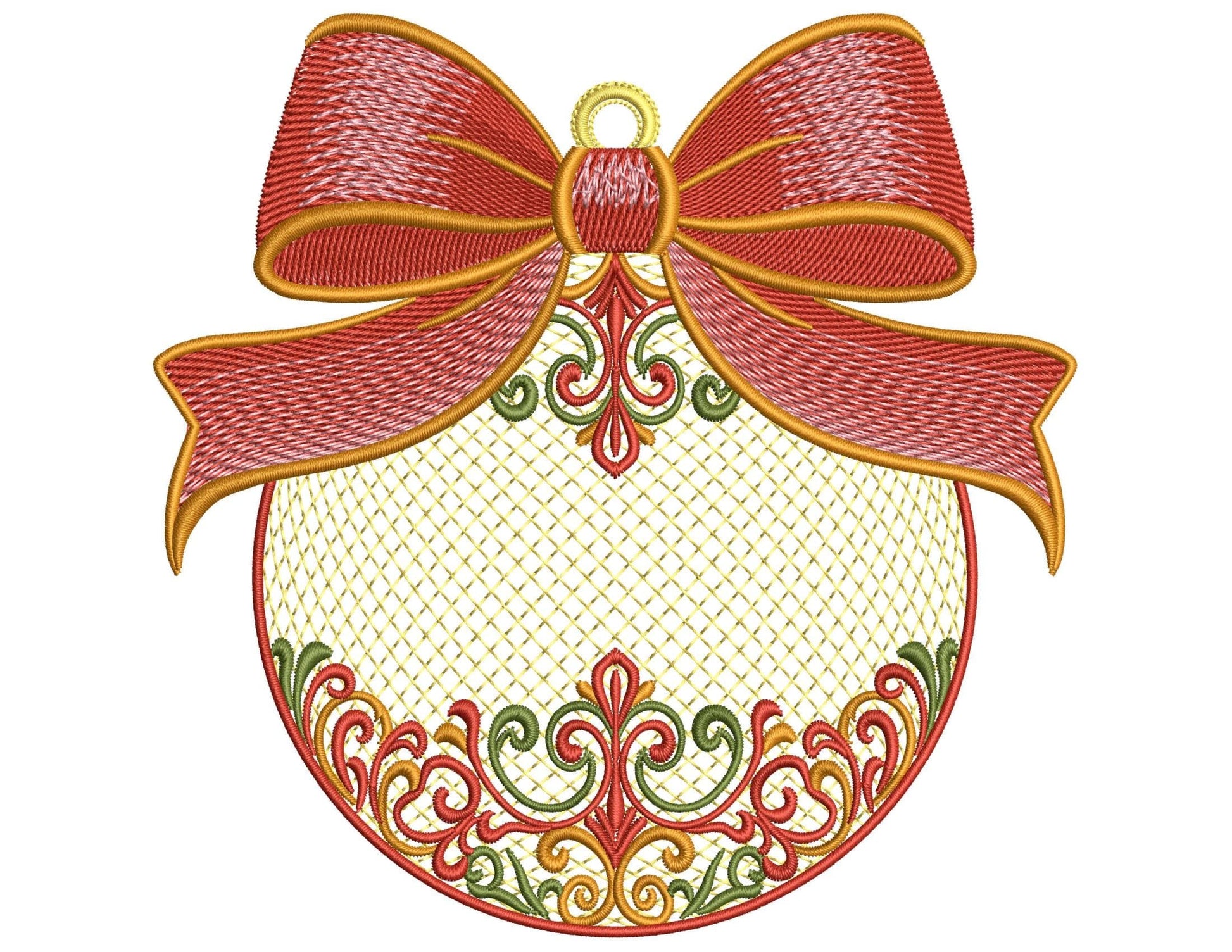 This stunning ornament features a beautifully satin-stitched bow, graceful swirls, festive colors, and a detailed lattice fill β perfect for adding a luxurious touch to your Christmas creations.