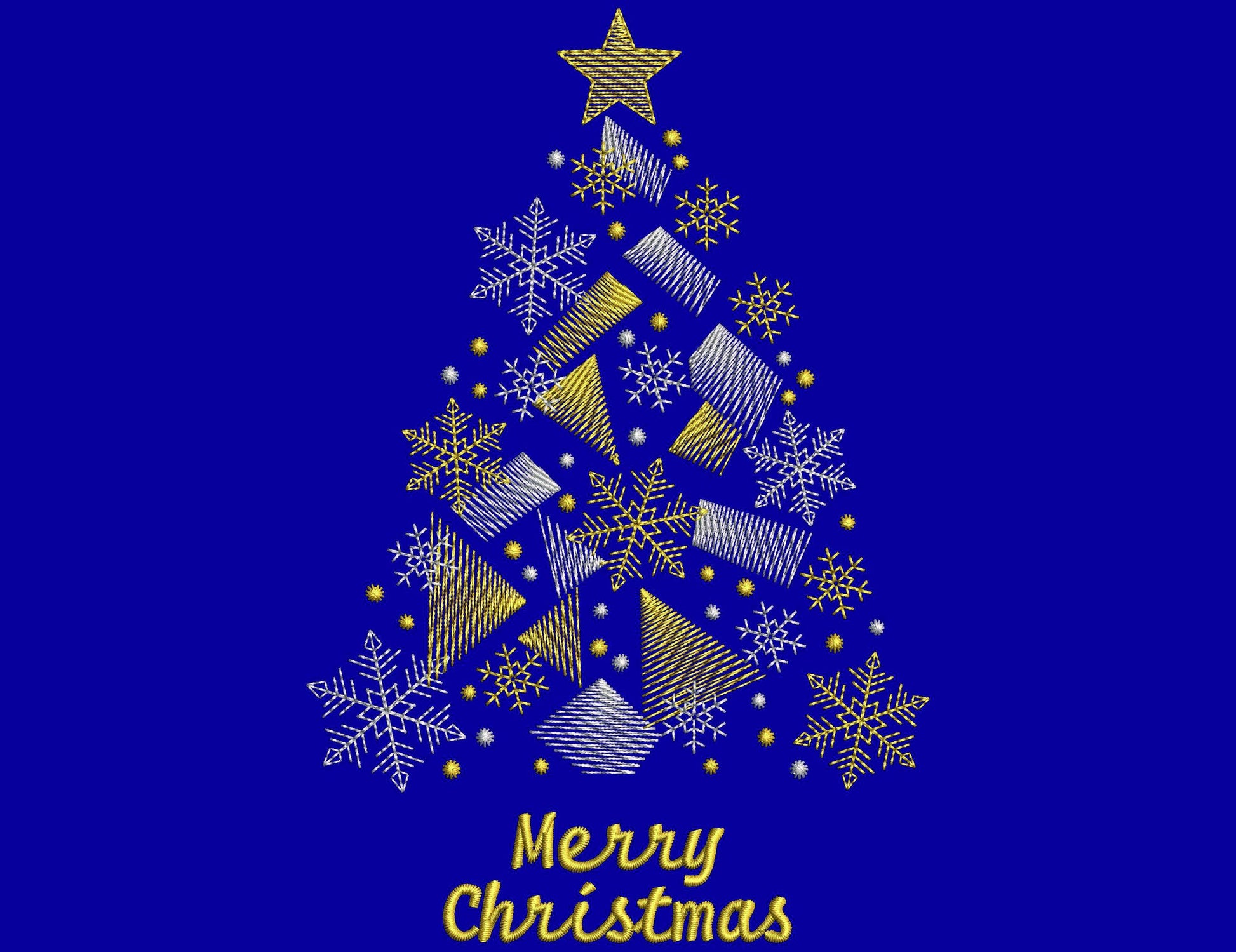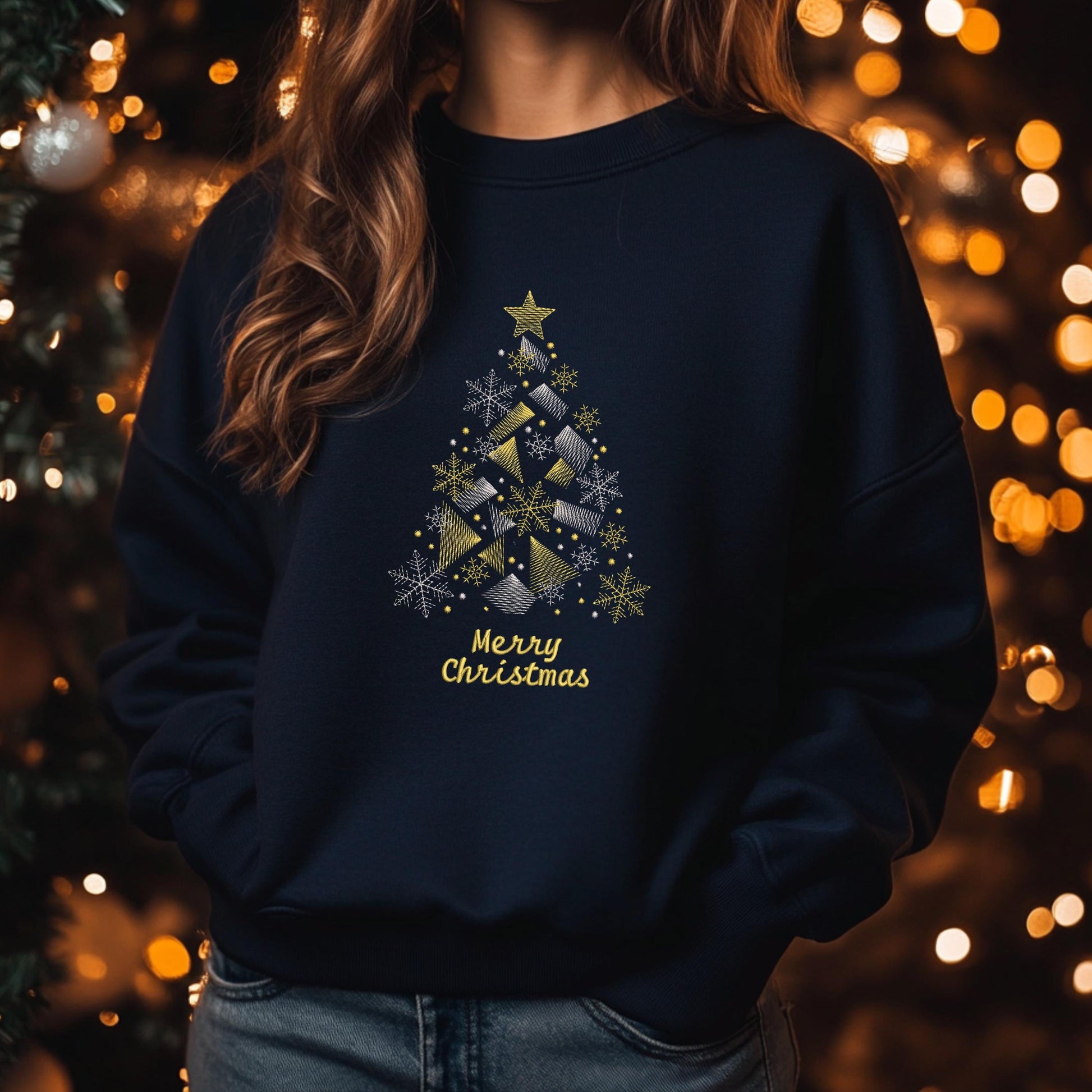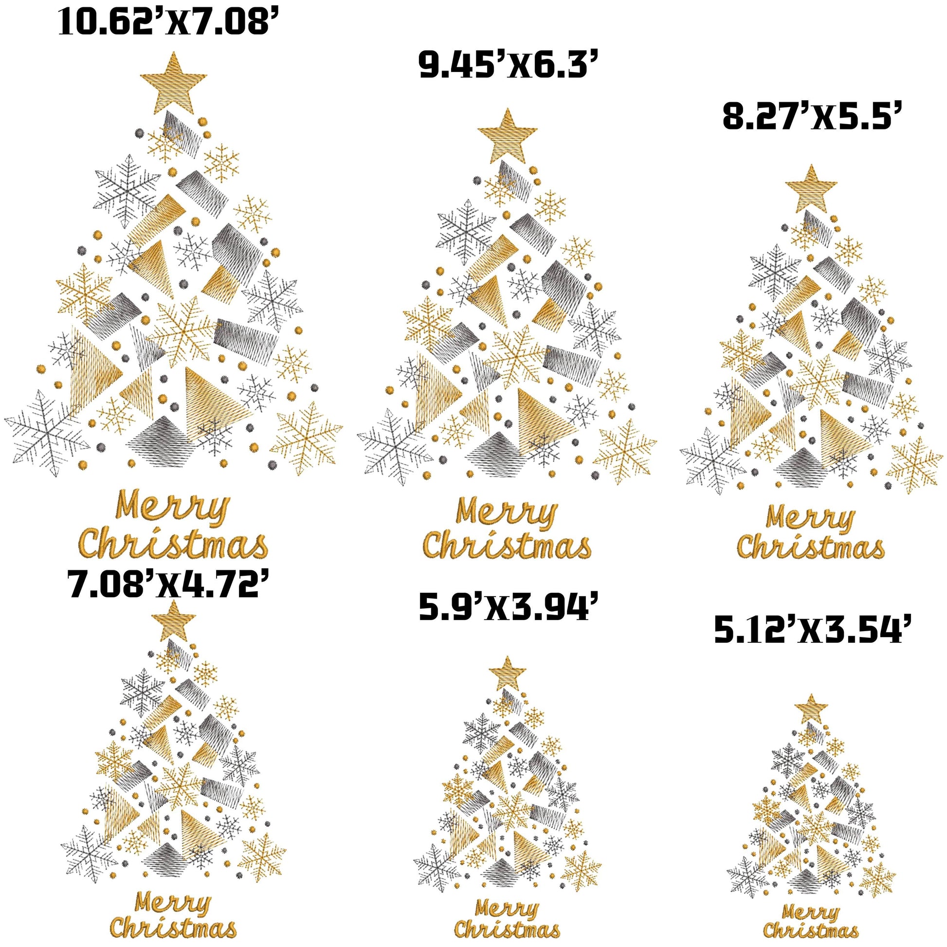 This is a modern and elegant Christmas tree embroidery design, perfect for decorating holiday projects. The design features a stylized Christmas tree composed of geometric shapes, stars, and snowflakes in gold and white thread. A large star sits at the top, adding a festive touch, with the text "Merry Christmas" elegantly embroidered at the bottom. This digital file is optimized for embroidery machines and can be used to embellish clothing, holiday decor, tote bags, or other fabric items. Ideal for DIY Christmas gifts or festive projects, this design will add a touch of holiday cheer to any item.