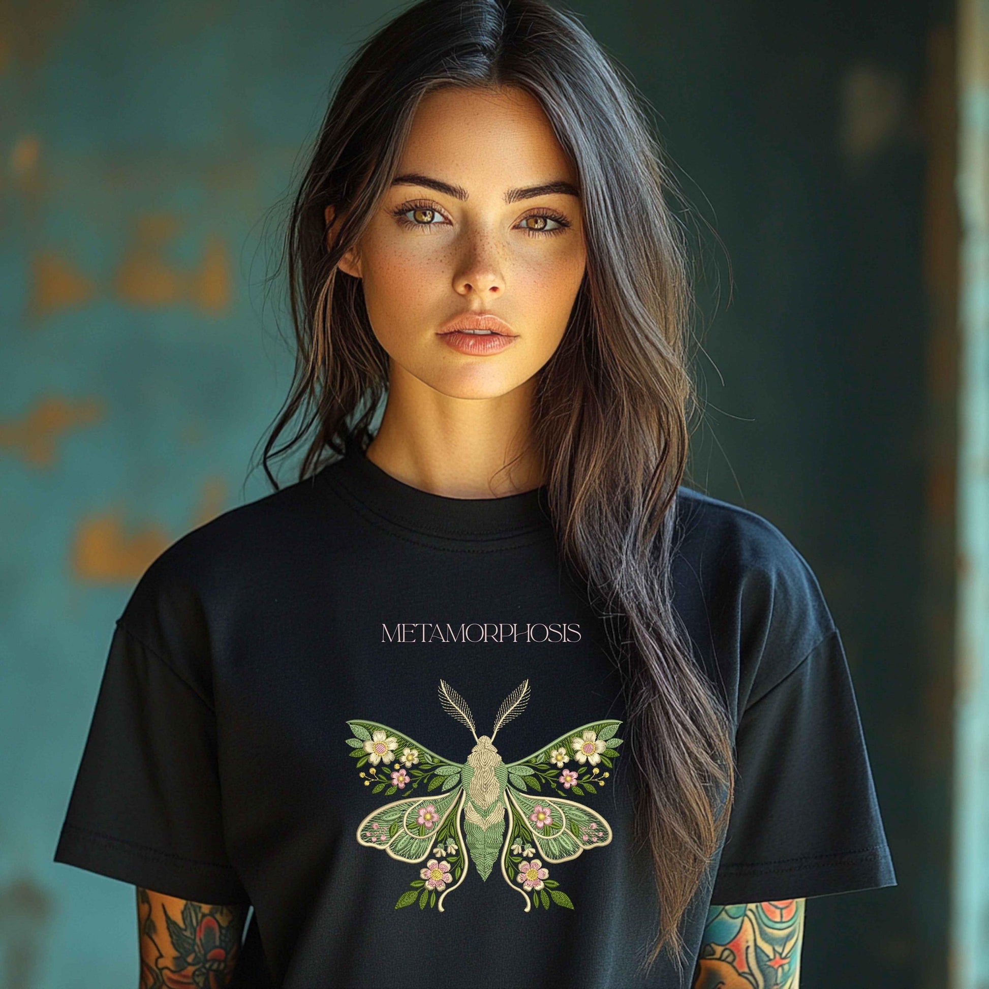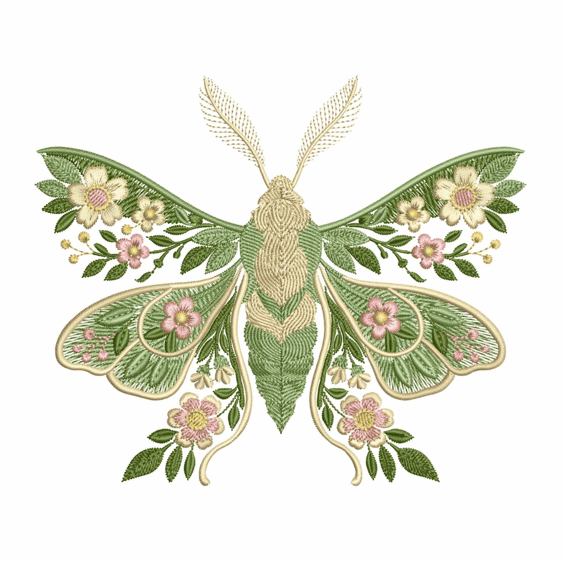 This symmetrical design features lush embroidered flowers, vines, leaves, and delicate moth wings that feel both romantic and whimsical. The composition captures the delicate beauty of a garden moth, surrounded by blooms and foliage in soft sage green, light green, ivory, coral pink, and golden yellow โ perfect for spring and summer embroidery projects.
