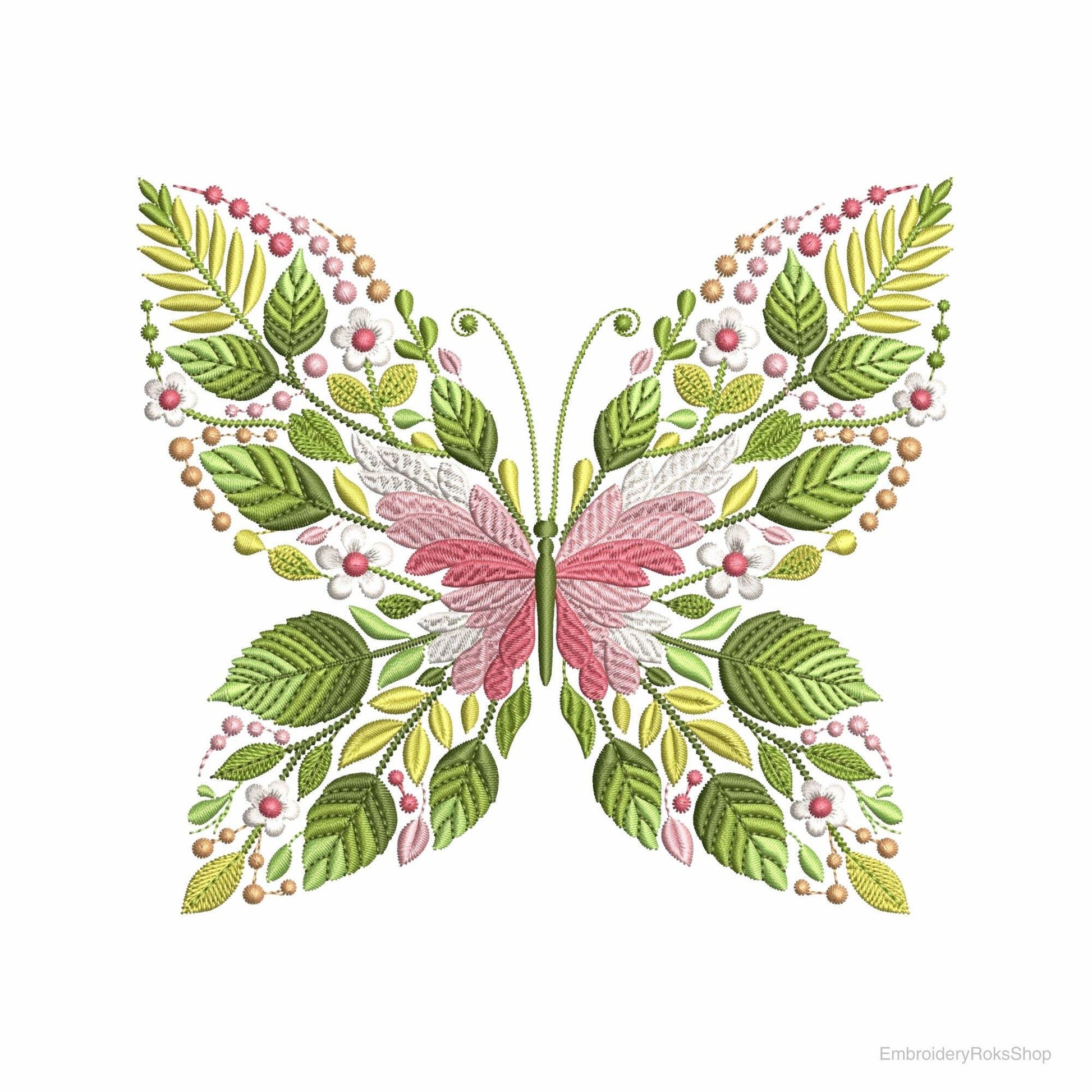 Delicate flowers, layered leaves, and perfectly balanced wings create a luxurious stitched artwork that looks stunning on garments and home dΓ©cor.