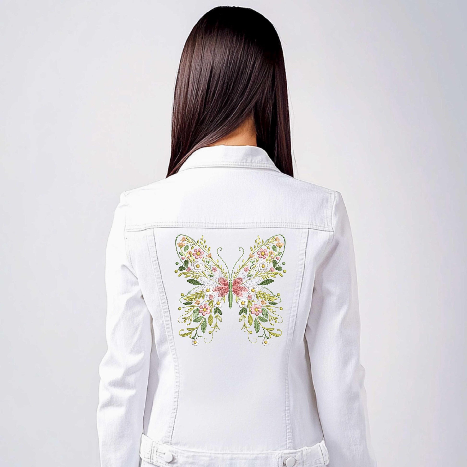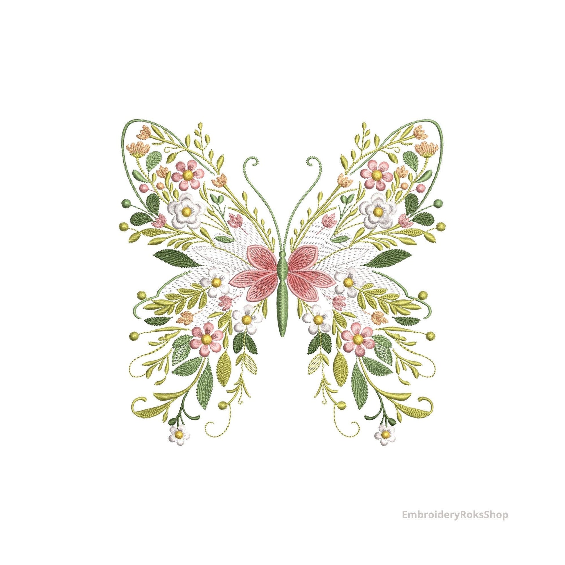 This detailed machine embroidery file features a butterfly with intricately woven flowers and leaves, ideal for clothing embellishment, home dΓ©cor, gifts, hoop art, tote bags, jackets, cushions, and more!