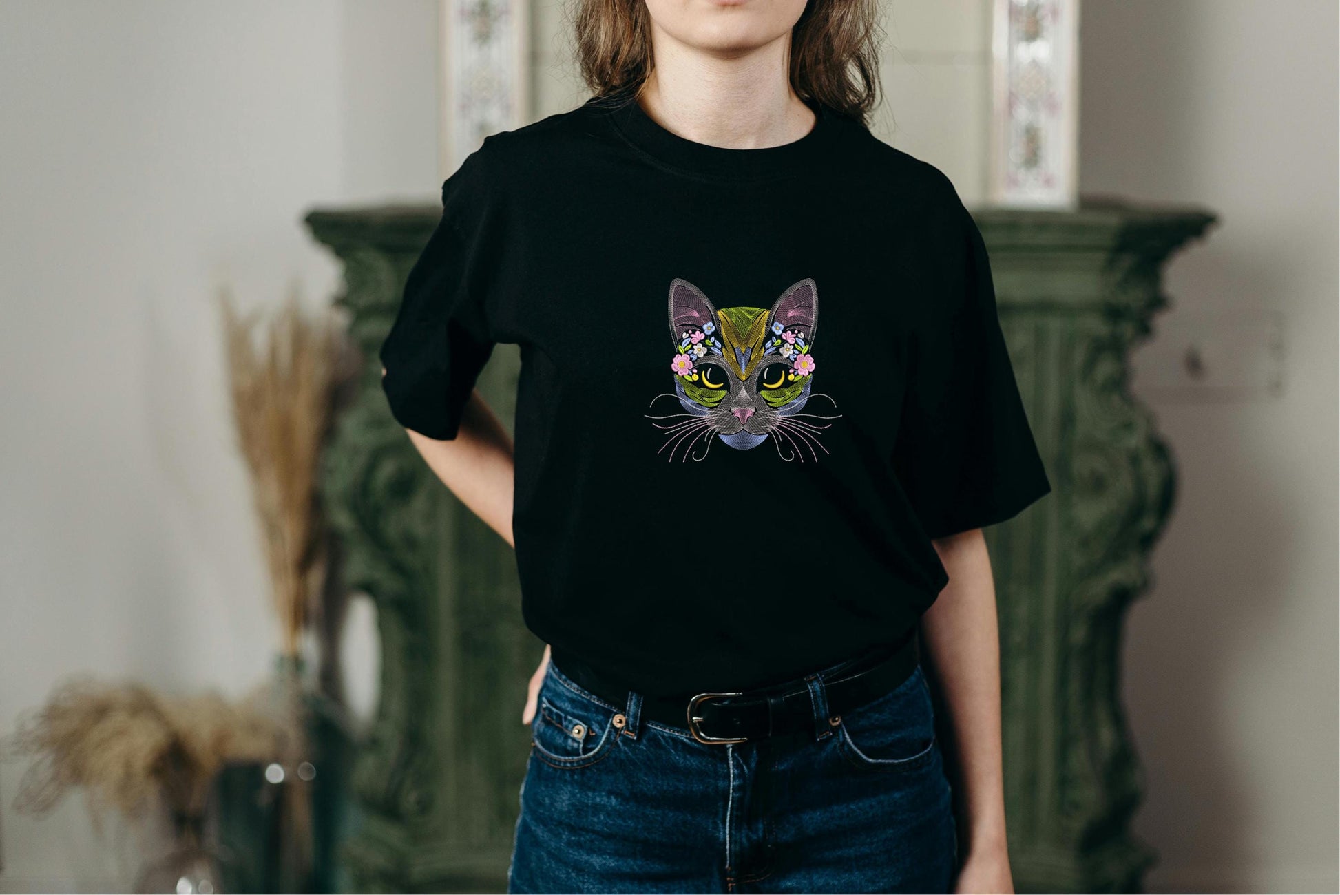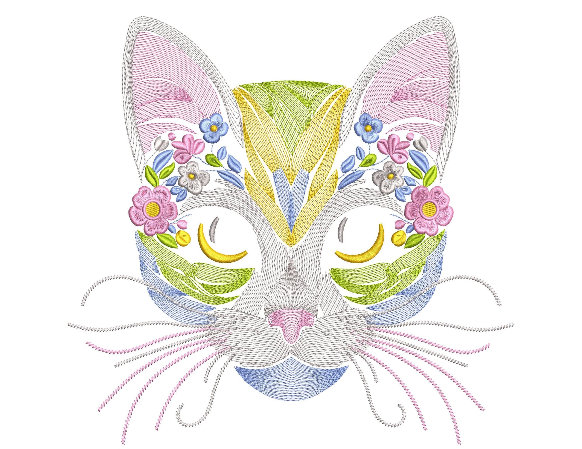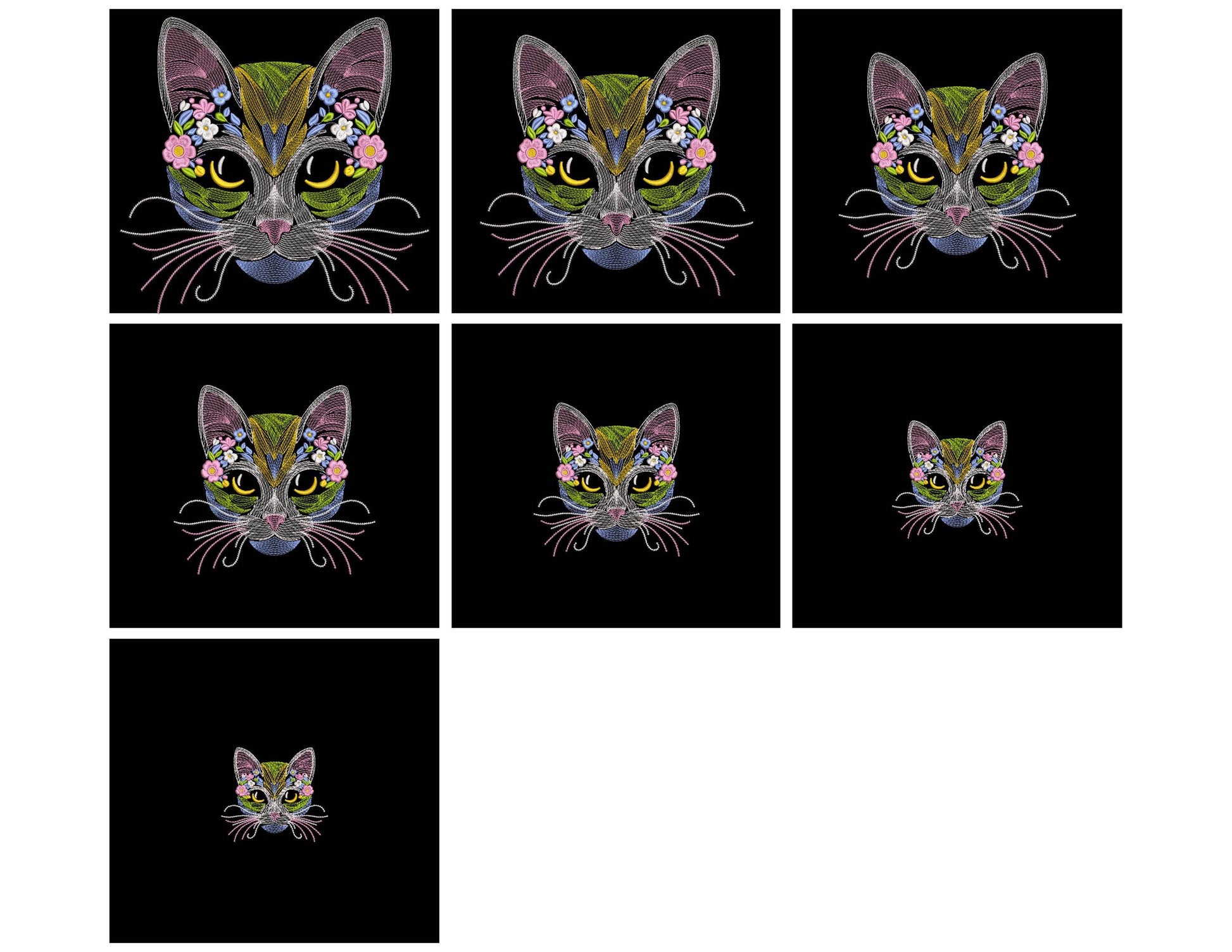 Floral cat embroidery design in 7 sizes. This design is suitable for embroidery on shopping bags, T-shirts, clothes. For all pet and cat lovers!