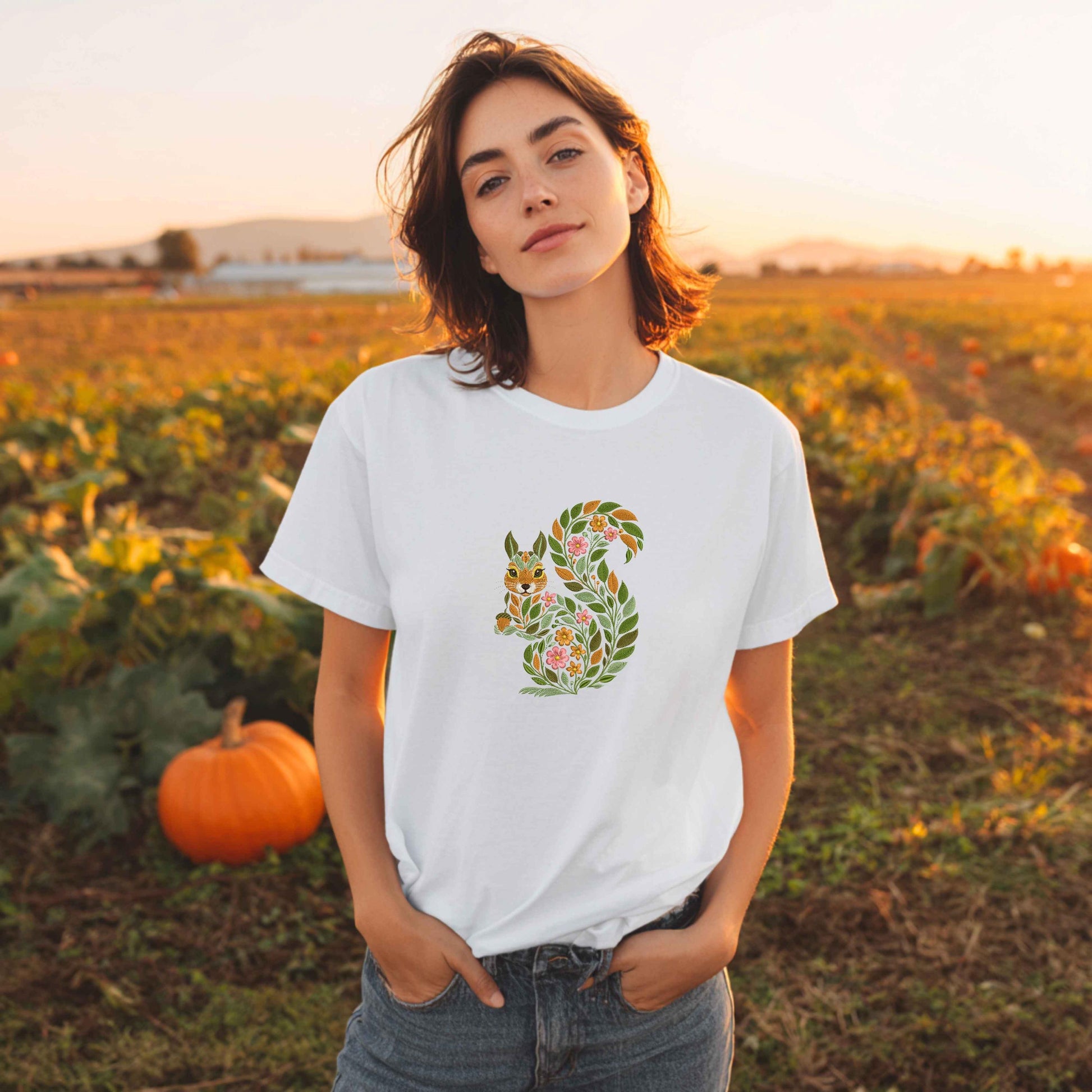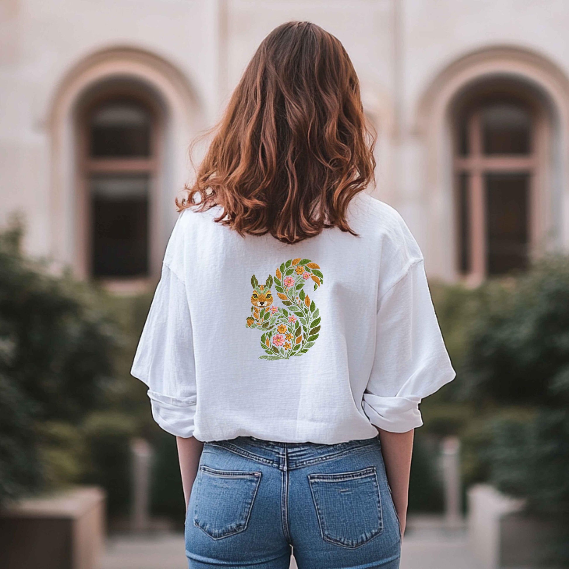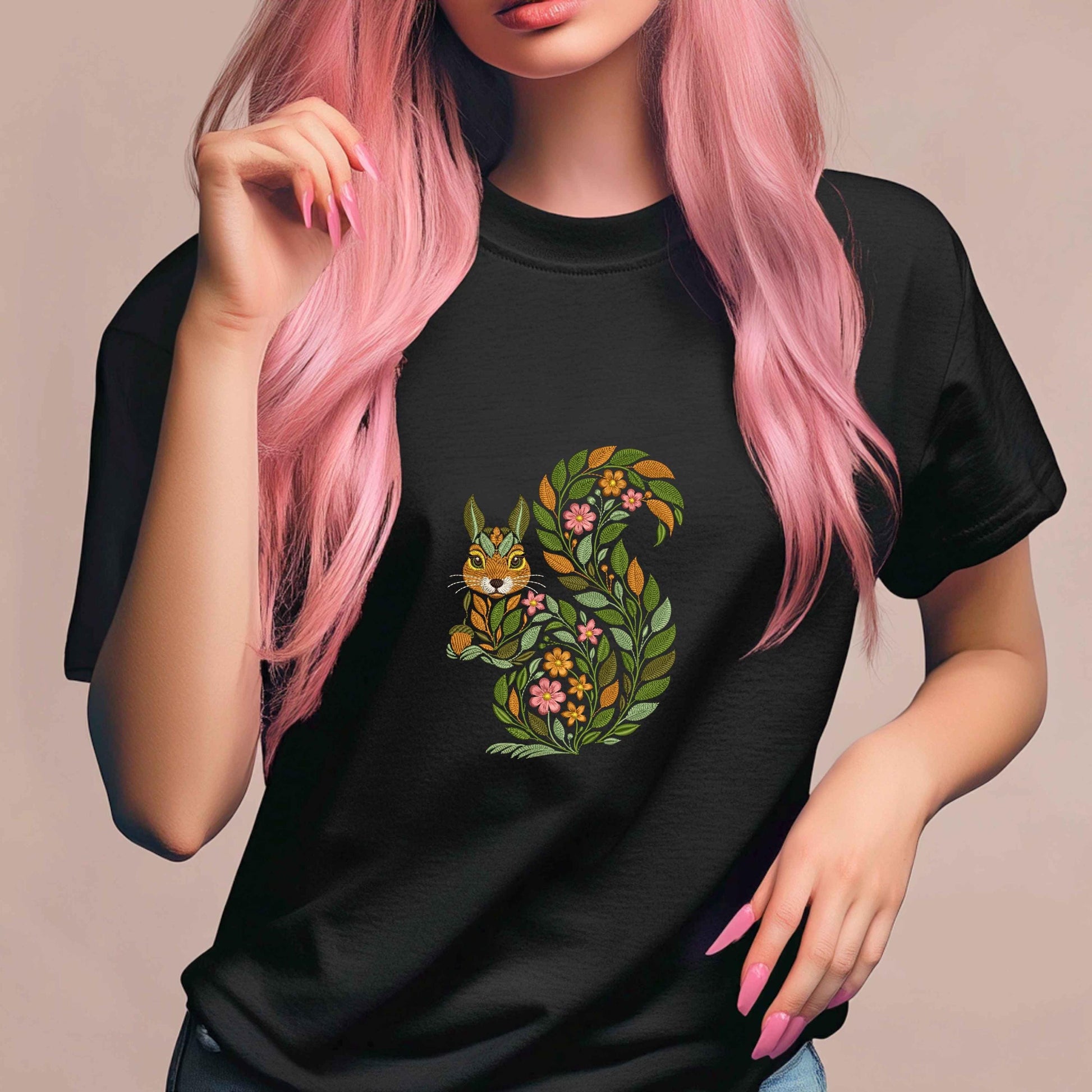 This leafy squirrel design offers a beautiful way to bring the outdoors into your projects, with its intricate details and whimsical floral elements. Whether you're creating home décor, apparel, or gifts, this charming design is perfect for those who love nature-inspired embroidery and want to add a bit of woodland magic to their creations!