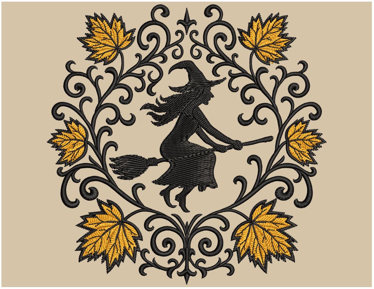 ๐ Spooky witch embroidery pattern | Flying witch for Halloween with autumn leaves ๐ | Instant download for machine embroidery ๐ป
