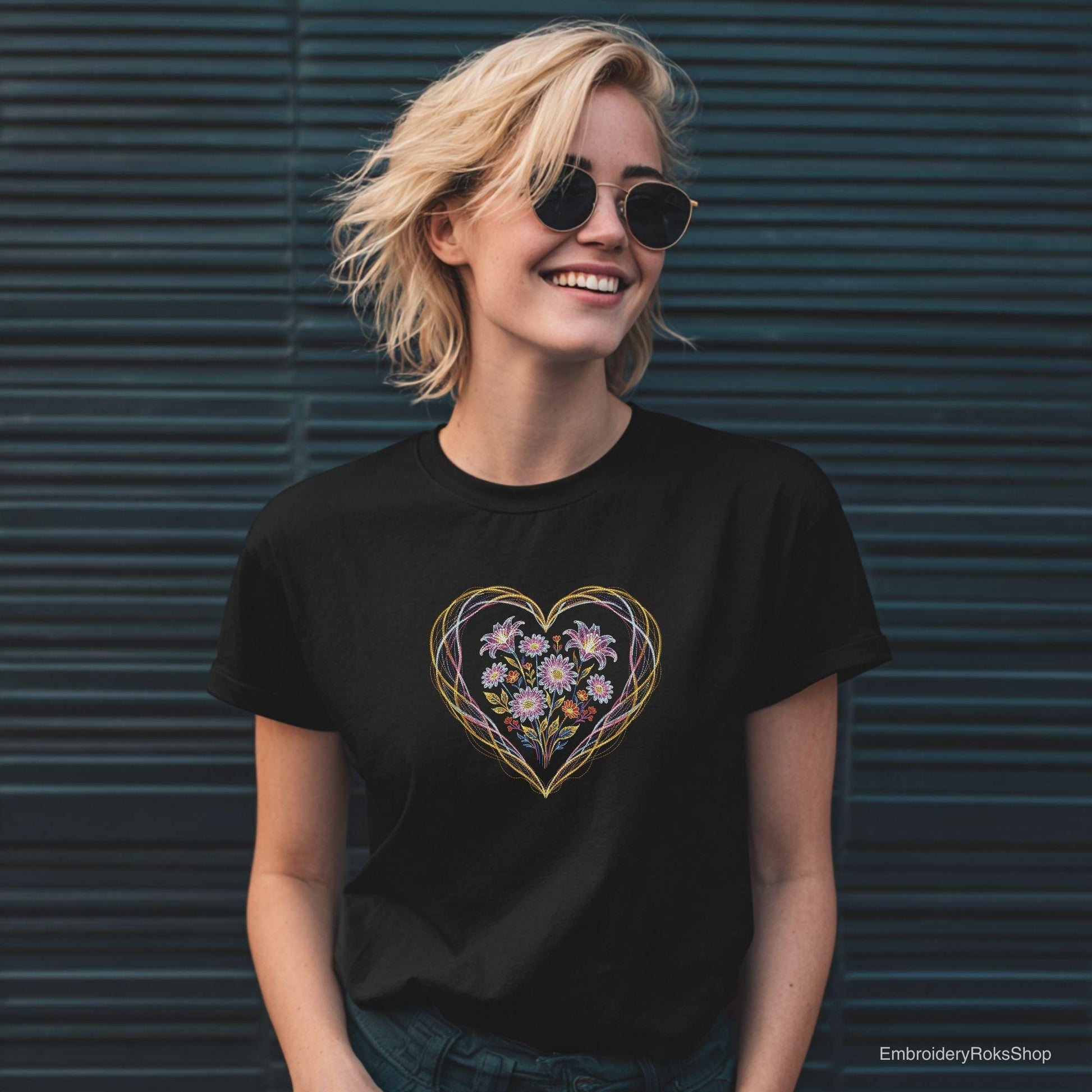 Bring a modern glow and romantic elegance to your projects with this neon-style floral heart embroidery design.