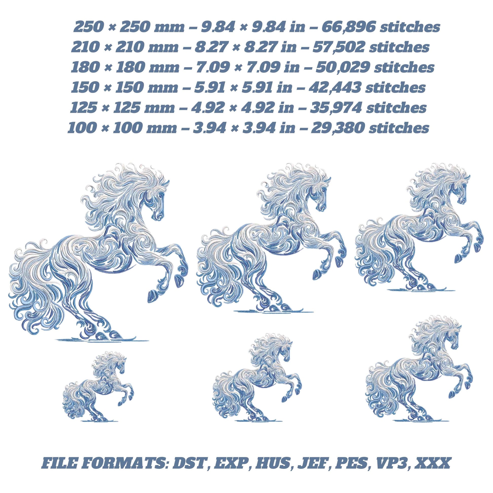 Inspired by flowing ice, snow, and motion, this design features a graceful rearing horse formed from elegant swirling stitches in cool blue tones.